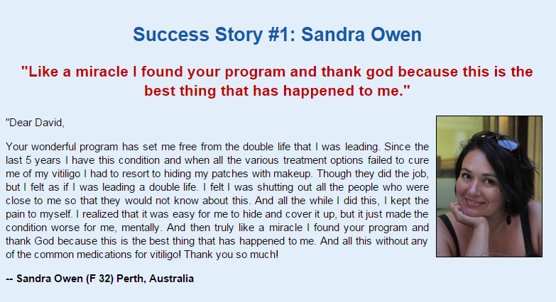 Vitiligo Miracle is current and well-considered, providing an honest and straight-forward assessment of every treatment available. The detailed review of Vitiligo David Paltrow has revealed various important facts about this program. The most important thing about this system is that it does not seem to be another online scam as it has been backed up by 100% money back guarantee.